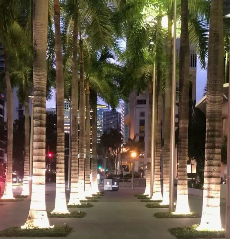 Palm tree lighting project using LED ring lights to create uniform walkway illumination in a commercial landscape.